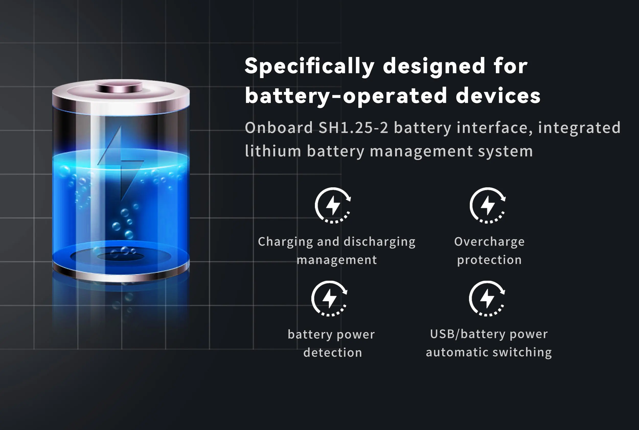 - 온보드 SH1.25-2 배터리 인터페이스, 통합 리튬 배터리 관리 시스템(충전 및 방전)