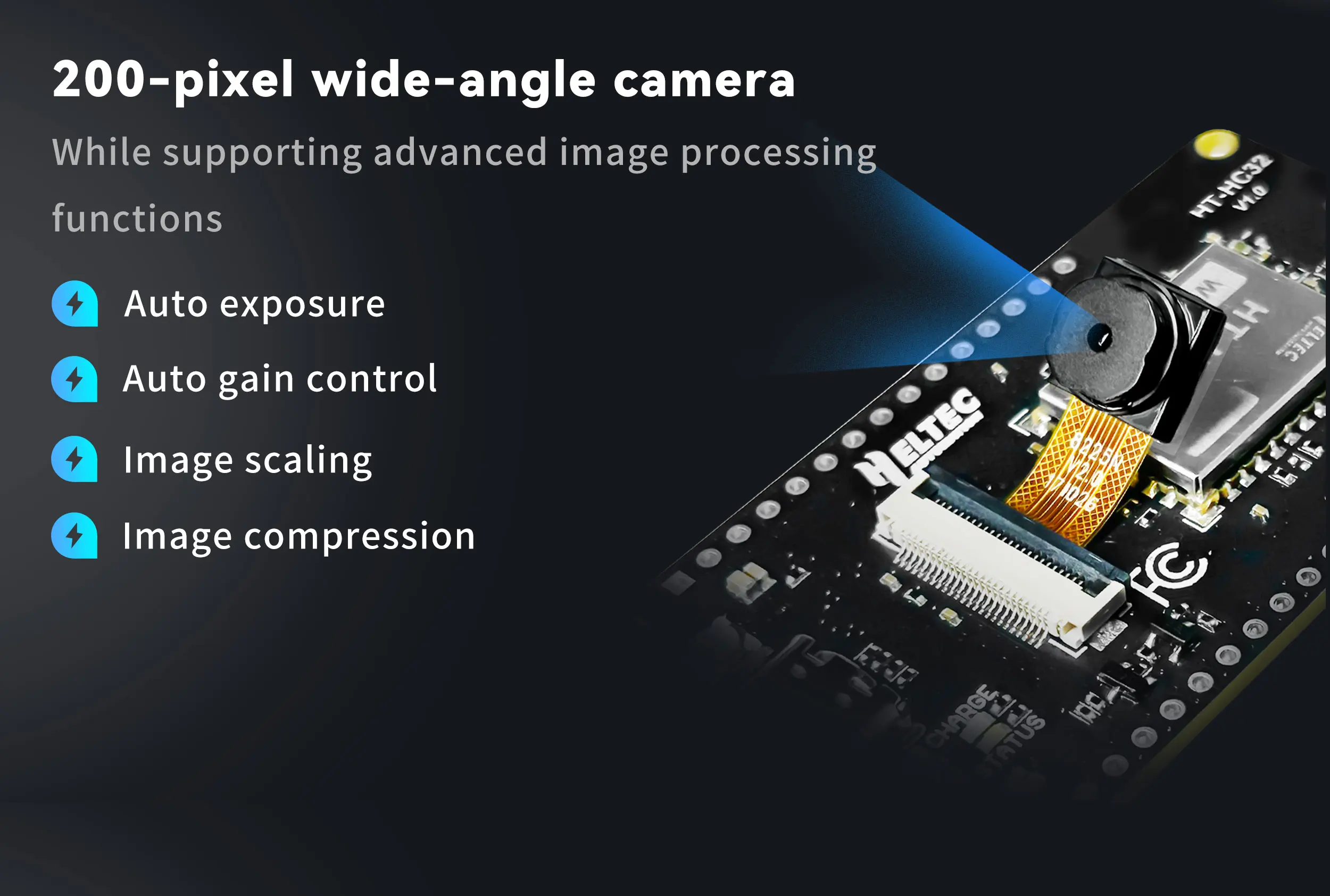 - 200픽셀 광각 카메라 통합, 자동 노출 제어, 자동 이득 제어, 이미지 스케일링 지원 이미지 압축 등