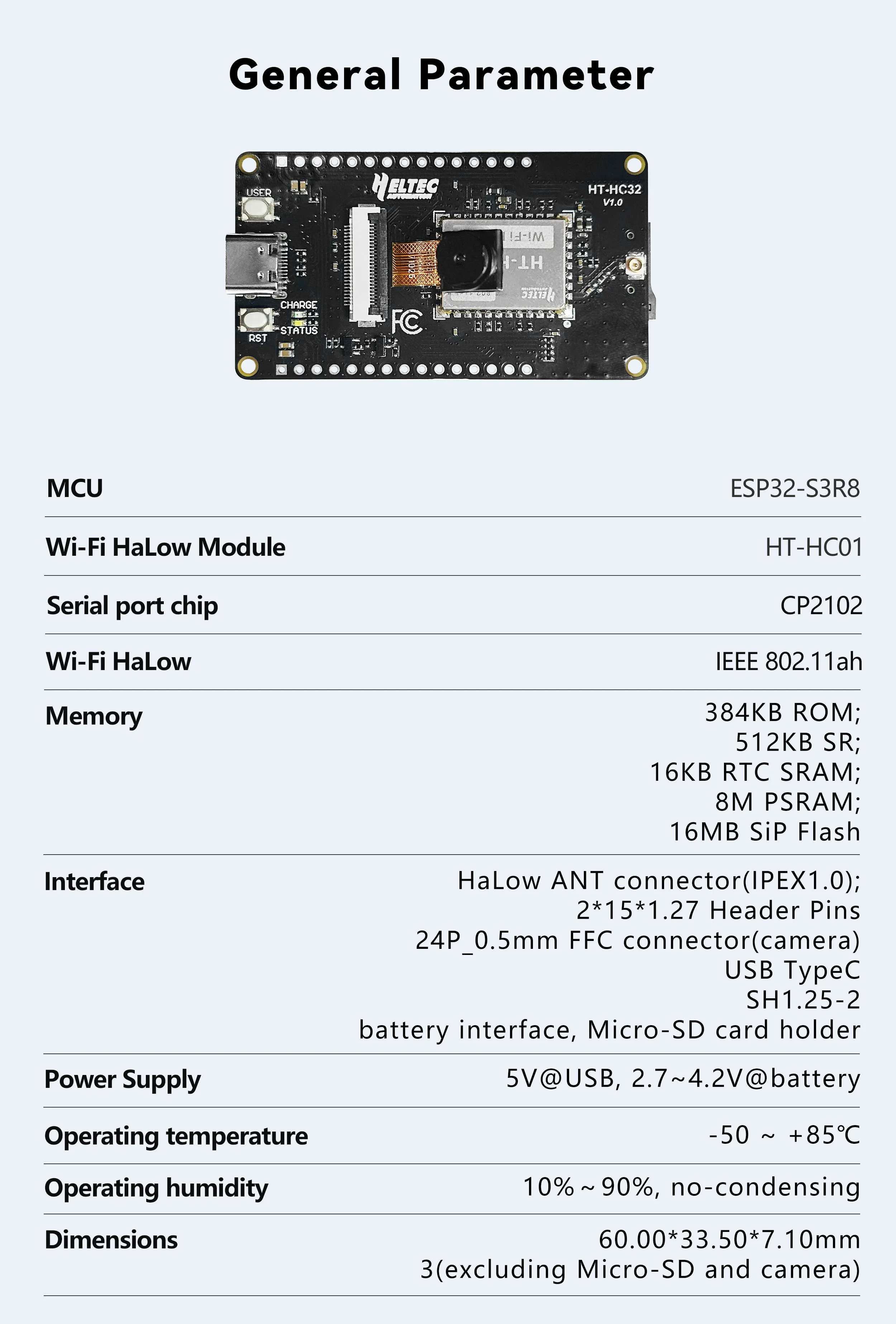 - MCU는 ESP32-S3이고 Wi-Fi HaLow 모듈은 HT-HC01입니다.