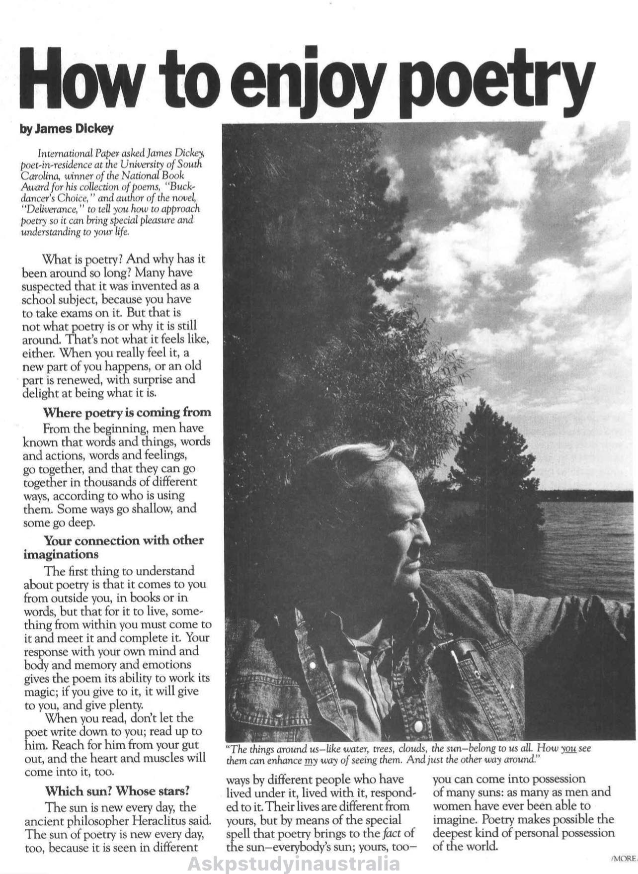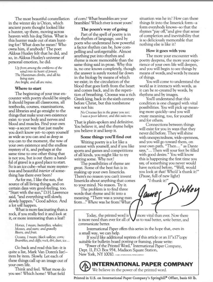 International Paper asked James Dickey, poet-in-residence at the University of South Carolina, winner of the National Book Award for his collection of poems, "Buck-dancer's Choice," and author of the novel, "Deliverance," to tell you how to approach poetry so it can bring special pleasure and understanding to your life.