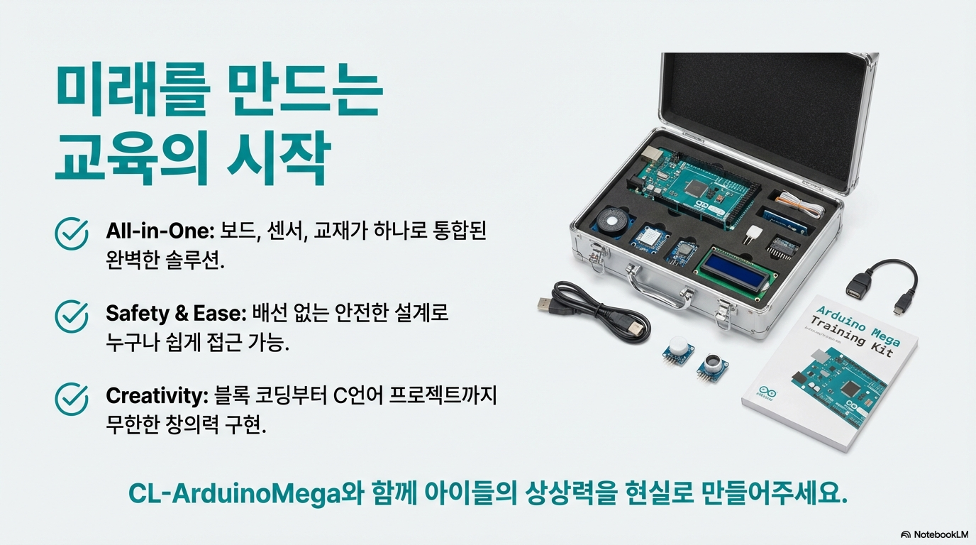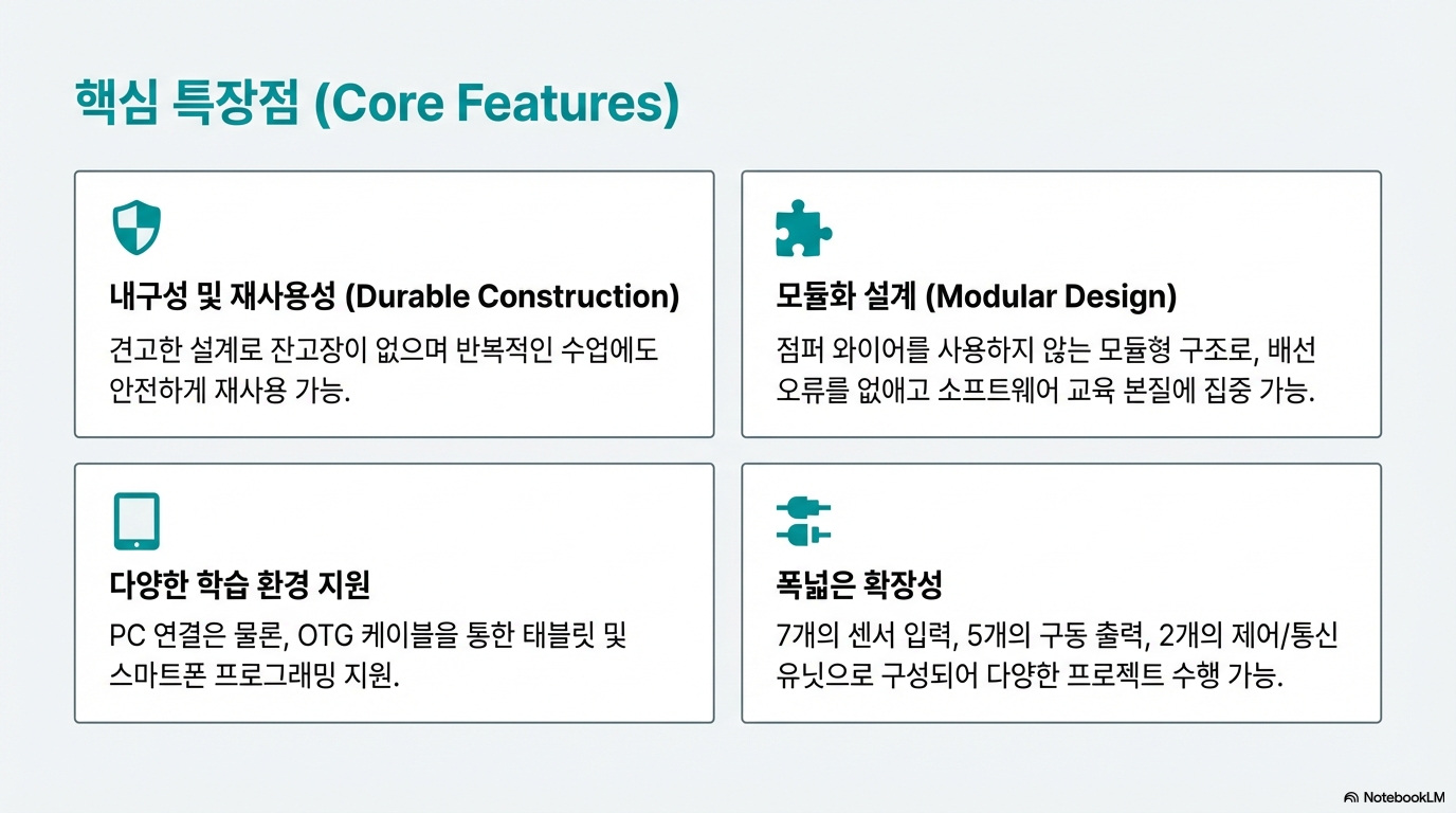 패키지에는 상세한 기술 사양 외에도 기초 문법부터 스마트 온실 제작과 같은 실전 프로젝트까지 다루는 체계적인 커리큘럼 교재가 포함되어 있습니다. 창의적인 아이디어를 즉각적으로 구현하고 테스트할 수 있는 전문적인 메이커 활동 지원 실습 키트입니다.