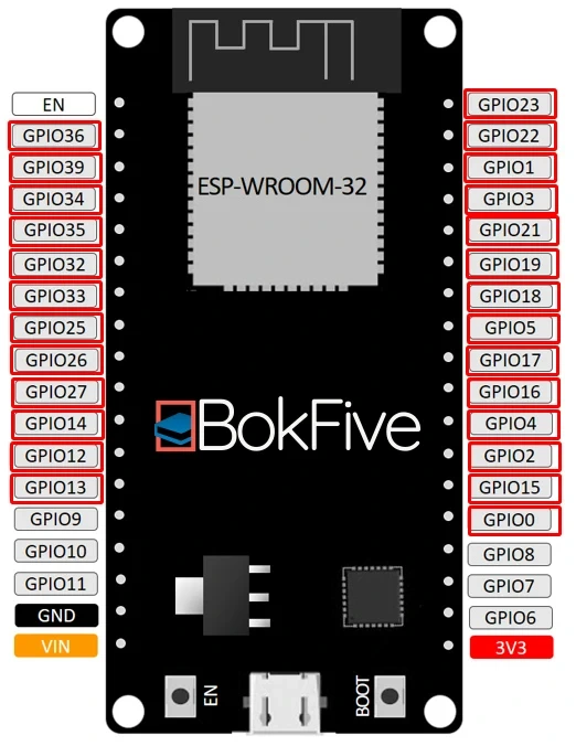 다음 다이어그램에서 빨간색 사각형으로 표시된 모든 핀은 ESP32 보드 에서 인터럽트 핀으로 설정할 수 있습니다 . 이 예에서는 PIR 모션 센서를 GPIO 27인터럽트로 연결하겠습니다 .