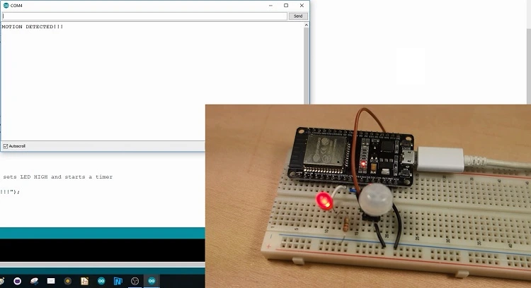 그러나 동작이 감지되면, 이전에 setup()에서 인터럽트를 설정했기 때문에 detectsMovement() 함수가 호출됩니다.