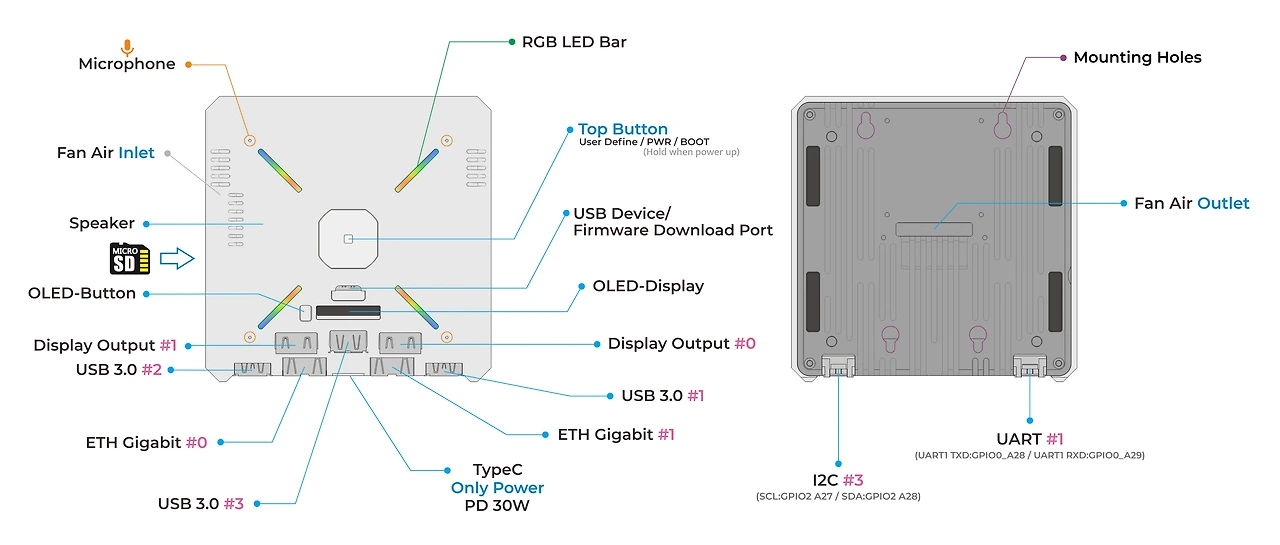 가비트 이더넷 포트 2개, USB 3.2 포트 4개, 데이터 및 전원 공급용 USB-C 포트 2개를 갖추고 있습니다. AI 비전 게이트웨이, 스마트 보안 시스템, 스마트 사진 앨범과 같은 시스템을 위한 데스크톱급 엣지 AI 컴퓨팅 플랫폼으로 활용할 수 있습니다.