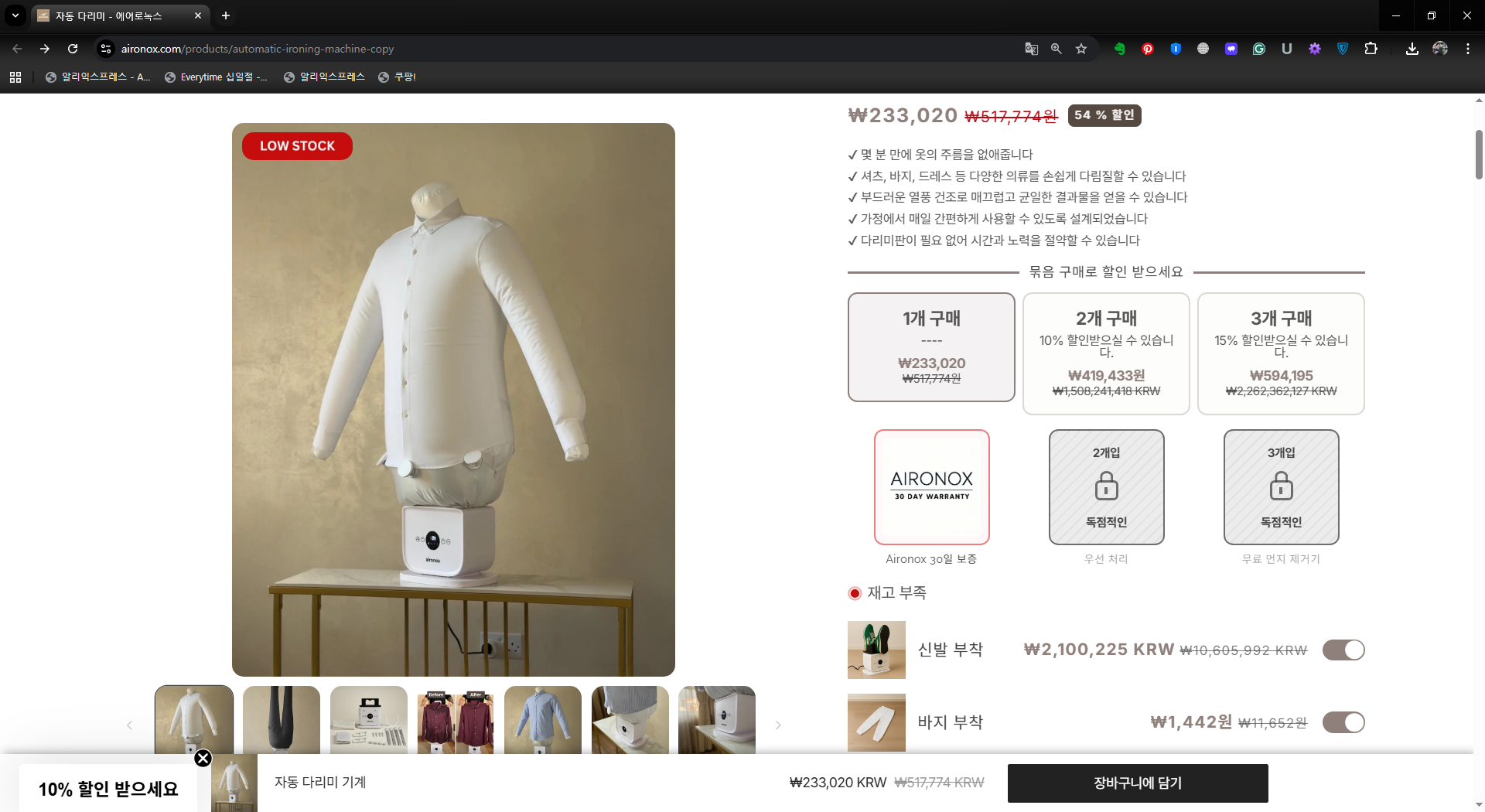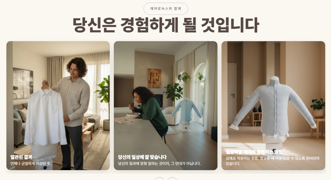 Aironox™ 자동 다리미는 매일 옷 관리를 더욱 빠르고 간편하게 만들어 줍니다. 정밀하게 제어된 열풍과 전용 의류 부착 장치를 사용하여 최소한의 노력으로 옷감을 매끄럽게 다려줍니다. 옷을 넣고 전원을 켜기만 하면 자동으로 다림질이 진행됩니다. 일반 가정에서 사용하기에 적합하게 설계된 Aironox™는 셔츠, 바지, 드레스 등 다양한 의류의 주름을 효과적으로 제거하면서도 옷감을 손상시키지 않습니다. 간편한 조작과 내구성 있는 구조를 갖춘 Aironox™는 시간과 노력을 절약하고 매일 깔끔하게 다려진 옷을 입을 수 있도록 도와줍니다.