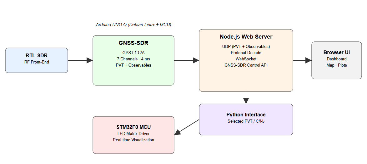 전용 파이썬 스크립트가 관련 GNSS-SDR 출력을 추출하여 Arduino UNO Q의 STM32F0 마이크로컨트롤러로 전달합니다.