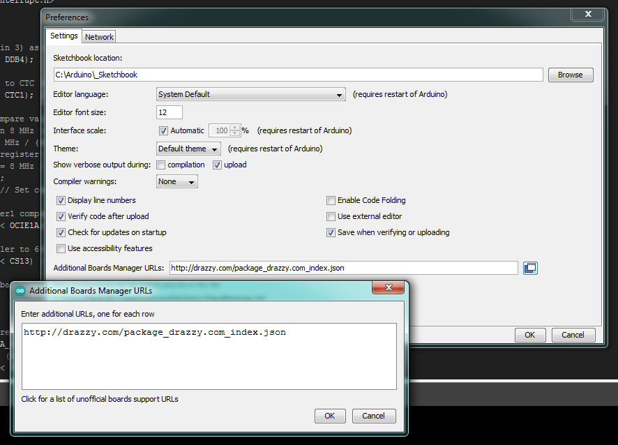 a. 메뉴에서 파일 -> 환경설정 (PC) 또는 Arduino -> 환경설정 (Mac)으로 이동하여 " 추가 보드 관리자 URL "에 위의 URL을 입력합니다.