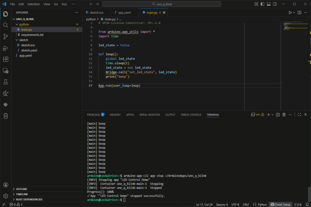 arduino-app-cli app stop ~/ArduinoApps/uno_q_blink