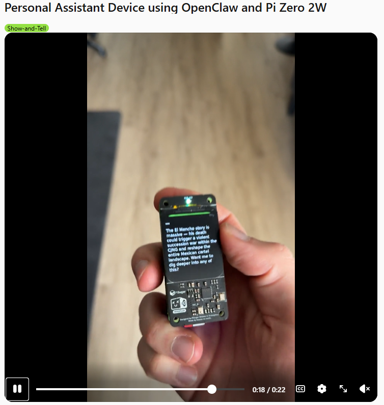 라즈베리파이제로 2W 모바일 OpenClaw 하드웨어. 저도 한번 만들어 보겠습니다. 셀룰러도 되면 좋은데 배터리가 못 버틸 것 같긴 해요. Reddit r/raspberry_pi에서 2.5천 좋아요를 받은 화제의 프로젝트입니다.