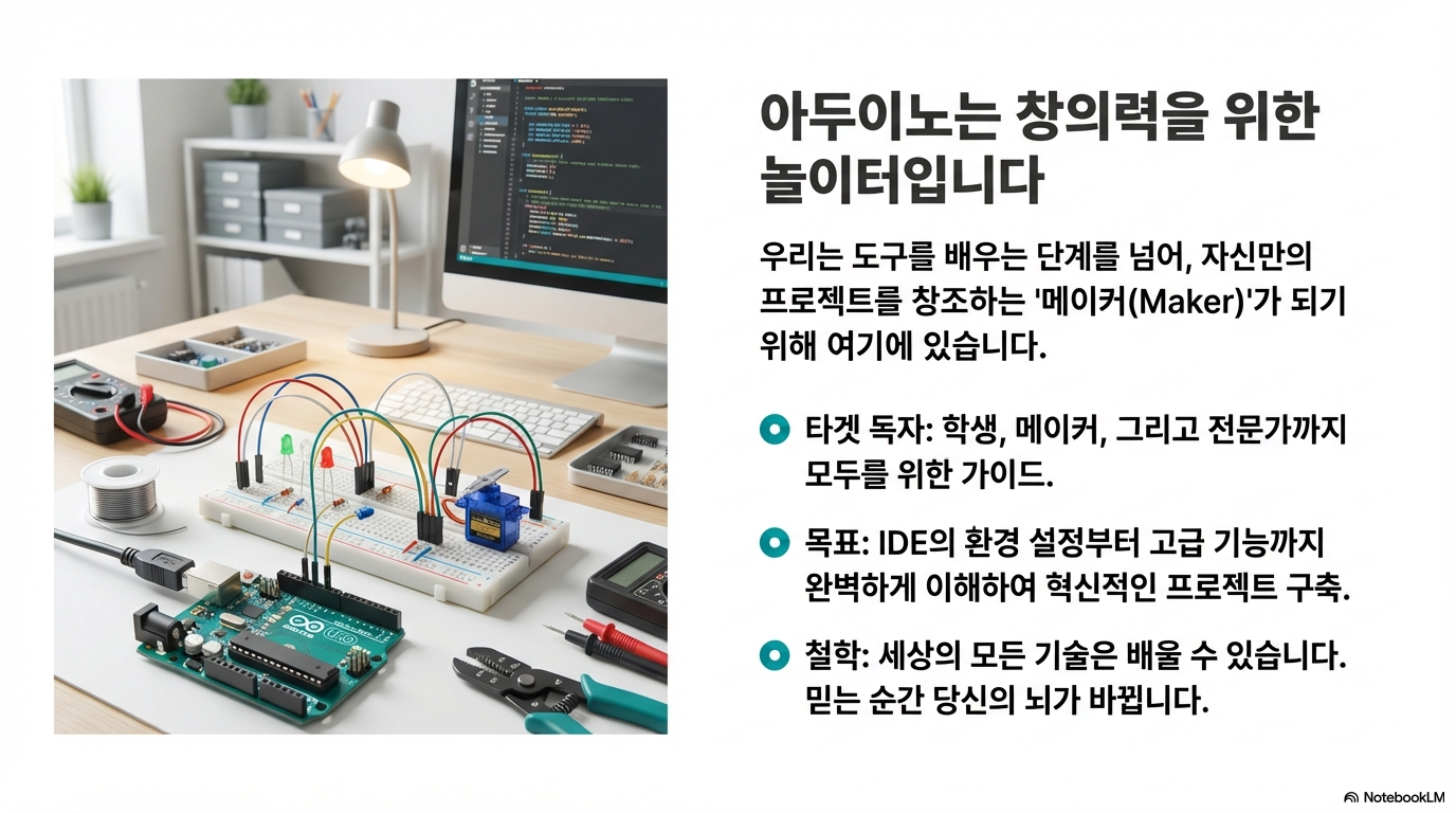 기술은 단순히 전문가의 영역이 아니라, 누구나 배우고 즐길 수 있는 '놀이 환경'이어야 합니다. Arduino IDE 완전 정복 가이드는 단순히 지식을 전달하는 것을 넘어, 학습자가 자신만의 혁신적인 프로젝트를 구축하는 수준 높은 제작자(Maker)로 성장할 수 있도록 돕고자 합니다.