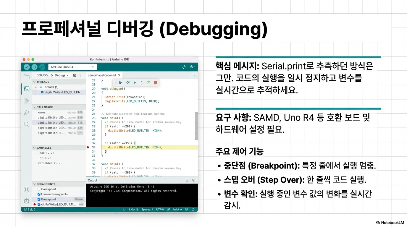 3. 데이터 시각화 및 정밀 디버깅 능력: 시리얼 모니터와 시리얼 플로터를 활용해 보드에서 전송되는 데이터를 그래프로 시각화하여 분석할 수 있으며, 내장 디버거를 통해 코드의 오류를 논리적으로 추적하고 수정하는 전문적인 개발 프로세스를 경험합니다.