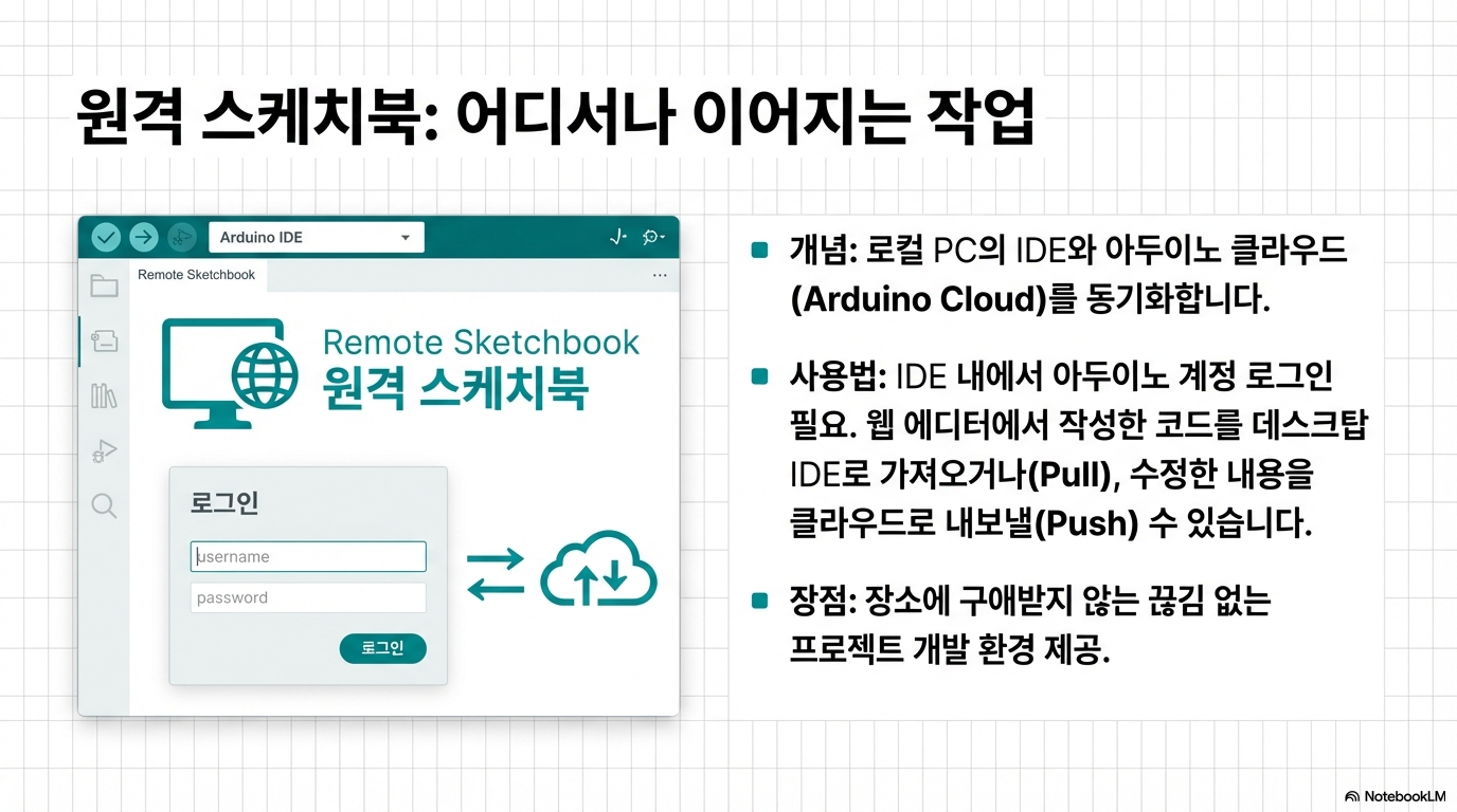4. 클라우드 기반의 유연한 개발 환경 구축: 원격 스케치북 기능을 활성화하여 로컬 컴퓨터와 아두이노 클라우드 간에 코드를 동기화함으로써, 장소와 기기에 구애받지 않고 어디서나 코딩을 이어가고 백업할 수 있는 스마트한 작업 환경을 운영하게 됩니다.