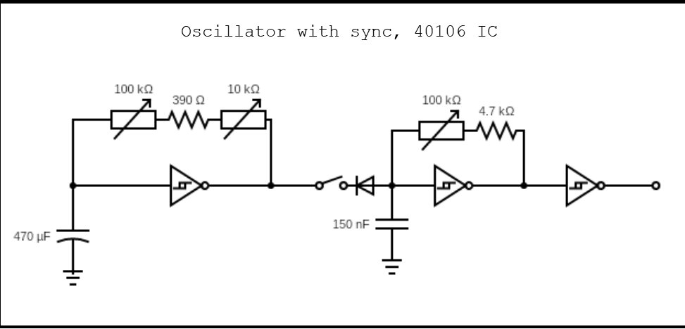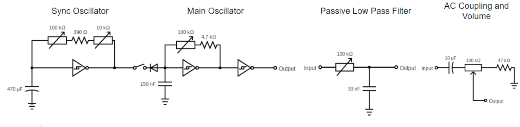 싱크 기능이 있는 가장 간단한 발진기입니다. 9~12V DC 어댑터로 전원을 공급하세요. 저렴한 액티브 스피커에 바로 연결해서 테스트할 수도 있지만, AC 커플러를 사용해서 볼륨 조절 장치를 추가하는 것을 추천합니다. 싱크 기능은 필수적인 것은 아니지만, 만들 수 있는 소리의 폭을 크게 넓혀줍니다. 제작 과정은 아래 영상에서 확인하세요.