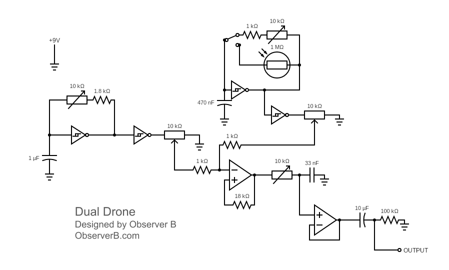 아래 회로도는 두 개의 발진기, 저역 통과 필터, 그리고 두 발진기의 소리를 합산하는 증폭기로 구성되어 있습니다. 광저항(LDR)은 빛 테레민처럼 작동하여 어떤 광원으로든 음높이를 조절할 수 있습니다. 전기 양초나 장난감 같은 독특한 광원을 사용해 보면 재미있는 소리를 만들어낼 수 있습니다.