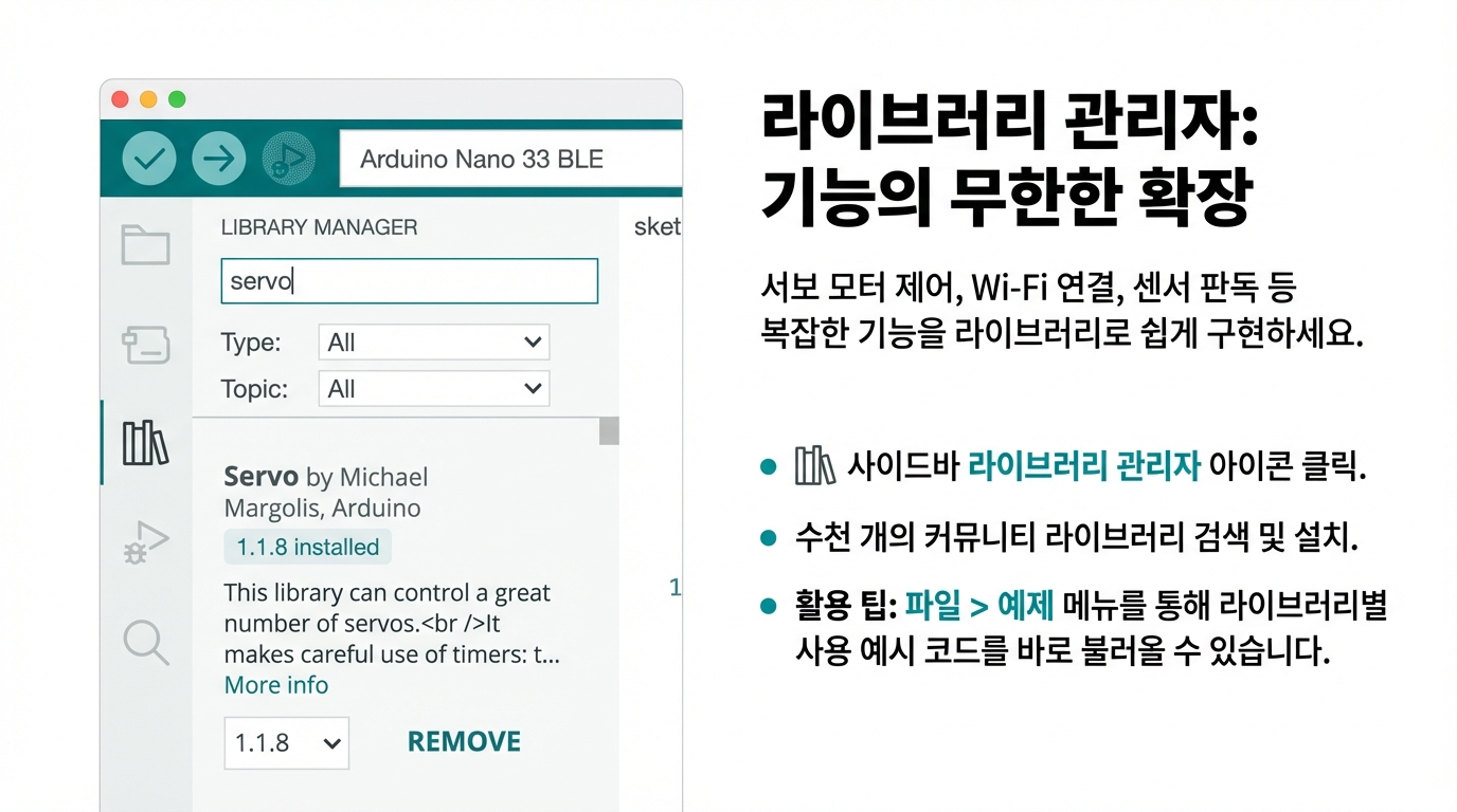 ● 최신 통합 개발 환경(IDE 2)의 완전한 통제: 학습자는 단순히 프로그램을 설치하는 수준을 넘어, 자동 완성, 내장 디버거, 보드 및 라이브러리 관리자 등 IDE 2의 강력하고 고도화된 기능들을 자유자재로 사용하여 개발 효율성을 극대화할 수 있는 능력을 갖추게 됩니다 .