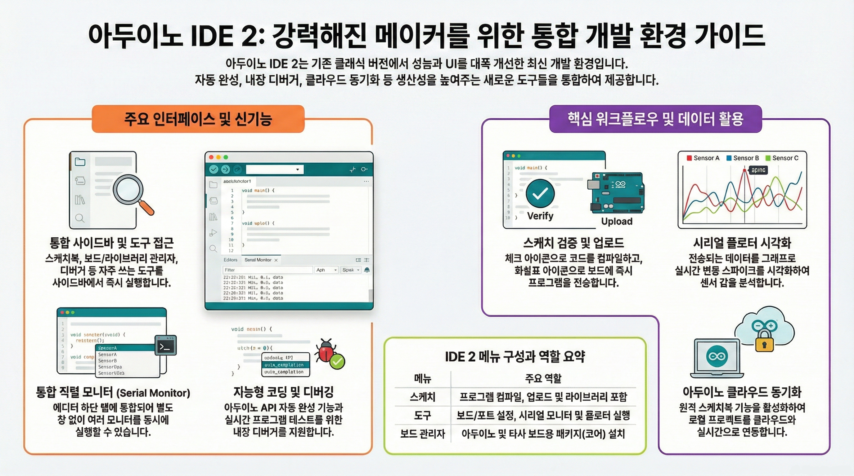 아두이노 IDE 2 통합 개발 환경의 설치부터 고급 활용까지 전 과정을 상세히 안내하는 완성형 가이드북입니다.