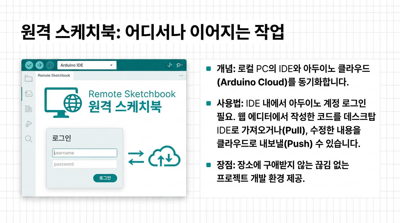 ● 클라우드 기반의 유연한 개발 환경 구축: 원격 스케치북 기능을 활성화하여 로컬 컴퓨터와 아두이노 클라우드 간에 코드를 동기화함으로써, 장소와 기기에 구애받지 않고 어디서나 코딩을 이어가고 백업할 수 있는 스마트한 작업 환경을 운영하게 됩니다 .