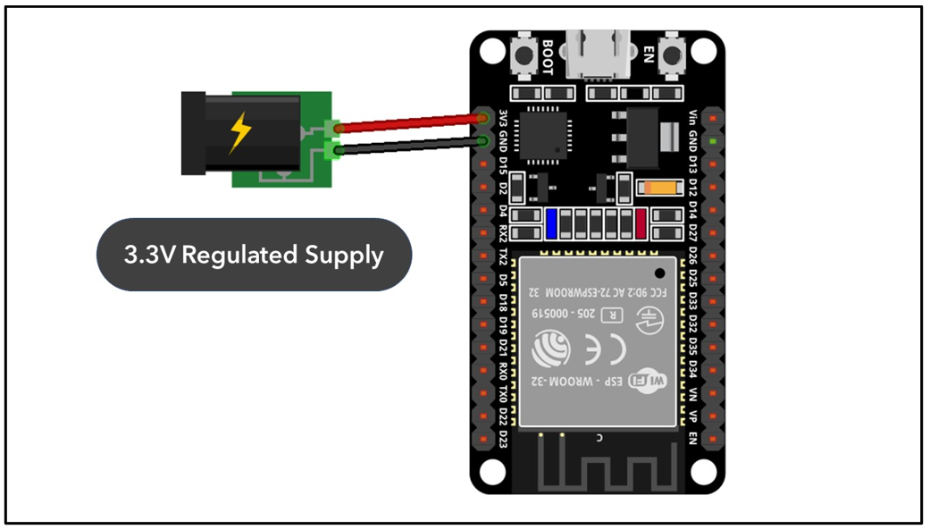ESP32에 전원을 공급하는 다음 방법은 3.3V 핀을 사용하는 것입니다. 이는 ESP32에 전원을 공급하는 가장 복잡한 방법입니다. 3.3V 핀은 센서 및 하드웨어 모듈 연결과 같은 출력 용도로 설계되었지만, 이 핀을 사용하여 ESP32에 전원을 공급하는 것도 가능합니다.