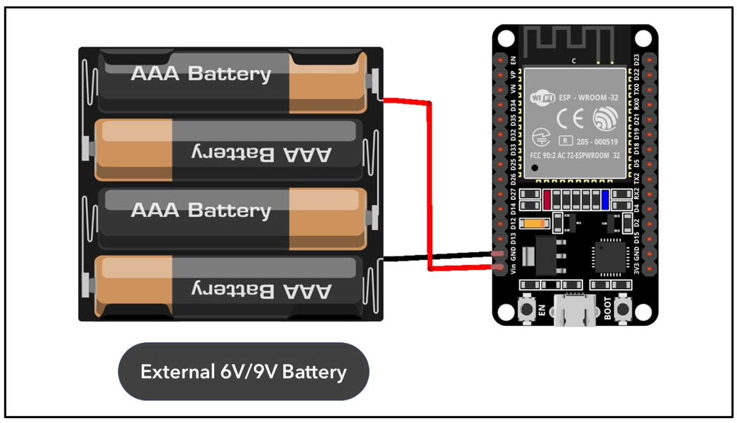 6V 또는 9V 외부 배터리를 사용하여 ESP32의 Vin 핀을 통해 전원을 공급할 수 있습니다. ESP32의 GND 핀과 배터리의 GND 핀을 연결하면 됩니다. ESP32의 Vin 핀에는 5V에서 12V 사이의 전압을 연결할 수 있지만, 9V 이상의 외부 배터리는 사용하지 않는 것이 좋습니다. ESP32는 작동에 3.3V만 필요하므로 나머지 전압은 LDO 전압 레귤레이터에서 열로 소산됩니다.