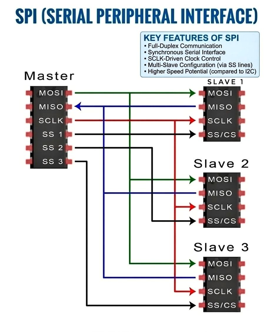 SPI(Serial Peripheral Interface)는 마이크로컨트롤러를 센서, 디스플레이, 메모리 칩, ADC/DAC 장치와 같은 주변 장치에 연결하는 데 널리 사용되는 고속 동기식 통신 프로토콜입니다.