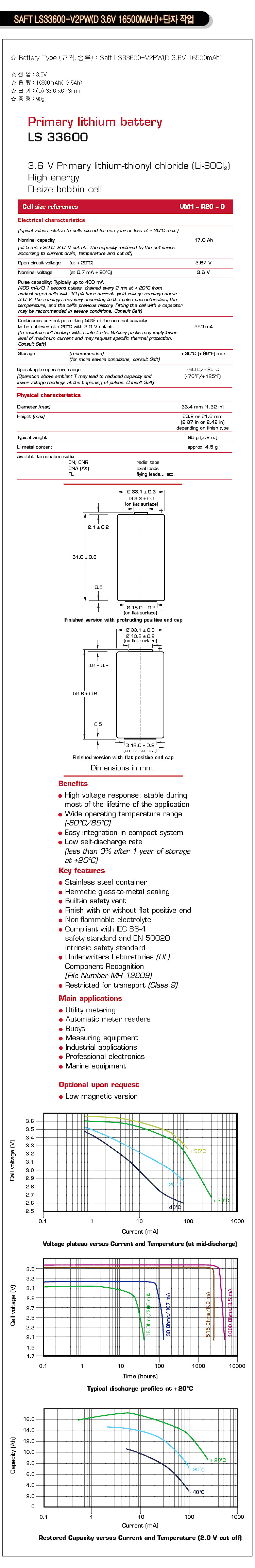 | 사이즈 | D Cell (Ø 33.4 x 61.5 mm) | D Cell (Ø 33.2 x 61.5 mm) | D Cell (Ø 33.4 x 61.5 mm) |