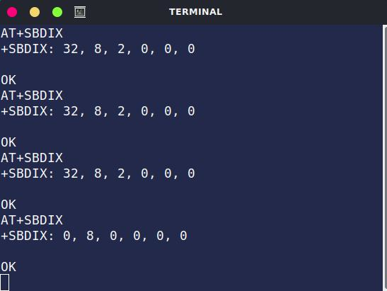 위성과 통신을 시도하고 일정 시간이 지난 후 +SBDIX: 32, 8, 2, 0, 0, 0 과 같은 상태를 반환합니다 .