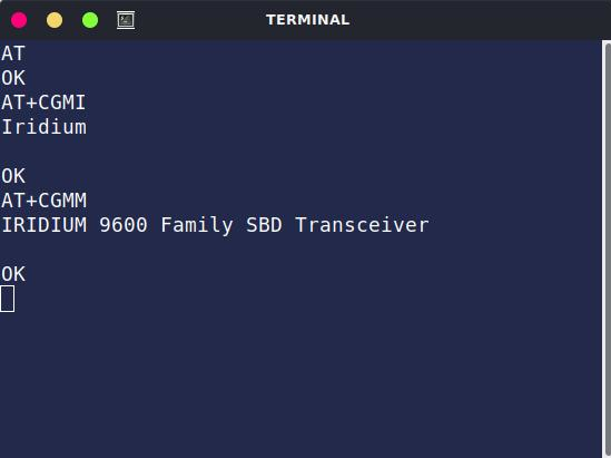 위성 데이터 전송을 시도하기 전에 기본 사항부터 확인해 보겠습니다. +CGMI 및 +CGMM 명령어를 사용하여 모델 정보를 얻습니다. 이 정보는 RockBLOCK 9603 모뎀에서 직접 제공되므로 위성 접속이 필요하지 않습니다.