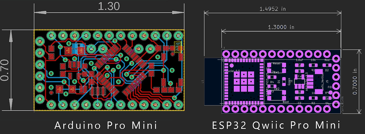 다음으로 두 보드의 크기를 확인했습니다. 보드를 보니 특히 ESP32의 안테나 때문에 크기 차이가 상당할 것이라는 것을 알 수 있었습니다. 실제로 ESP32 Qwiic Pro Mini 보드는 ESP가 장착된 상태에서 Arduino Pro Mini보다 눈에 띄게 큽니다.
