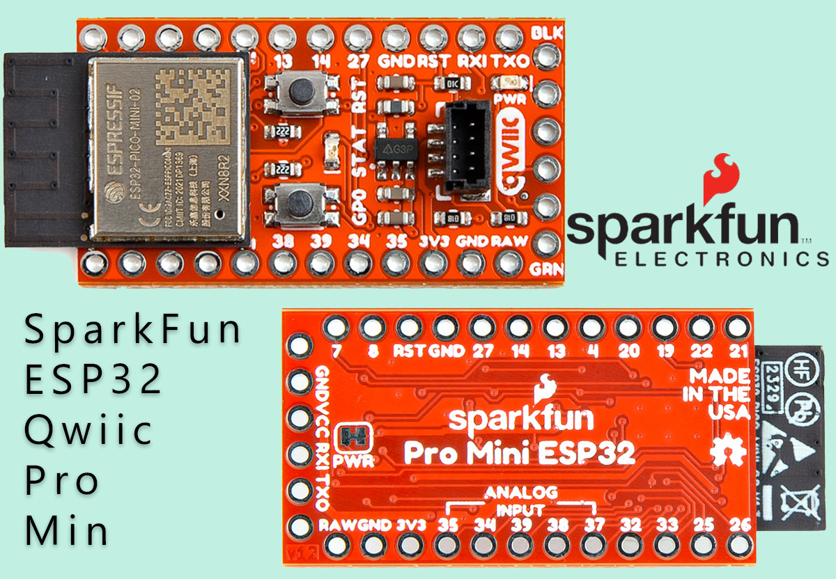 SparkFun의 최신 개발 보드인 ESP32 Qwiic Pro Mini는 Espressif ESP32-PICO-MINI-02 마이크로컨트롤러를 컴팩트한 Arduino Pro Mini 크기에 담았습니다. 또한, 다양한 센서 및 주변 장치와의 손쉬운 연결을 위해 QWICC 커넥터가 내장되어 있습니다. SparkFun의 다른 개발 보드인 DataLogger IoT, Datalogger IoT – 9DoF, SparkFun Thing Plus Matter에 대한 자세한 내용은 이미 참고해 보시기 바랍니다.