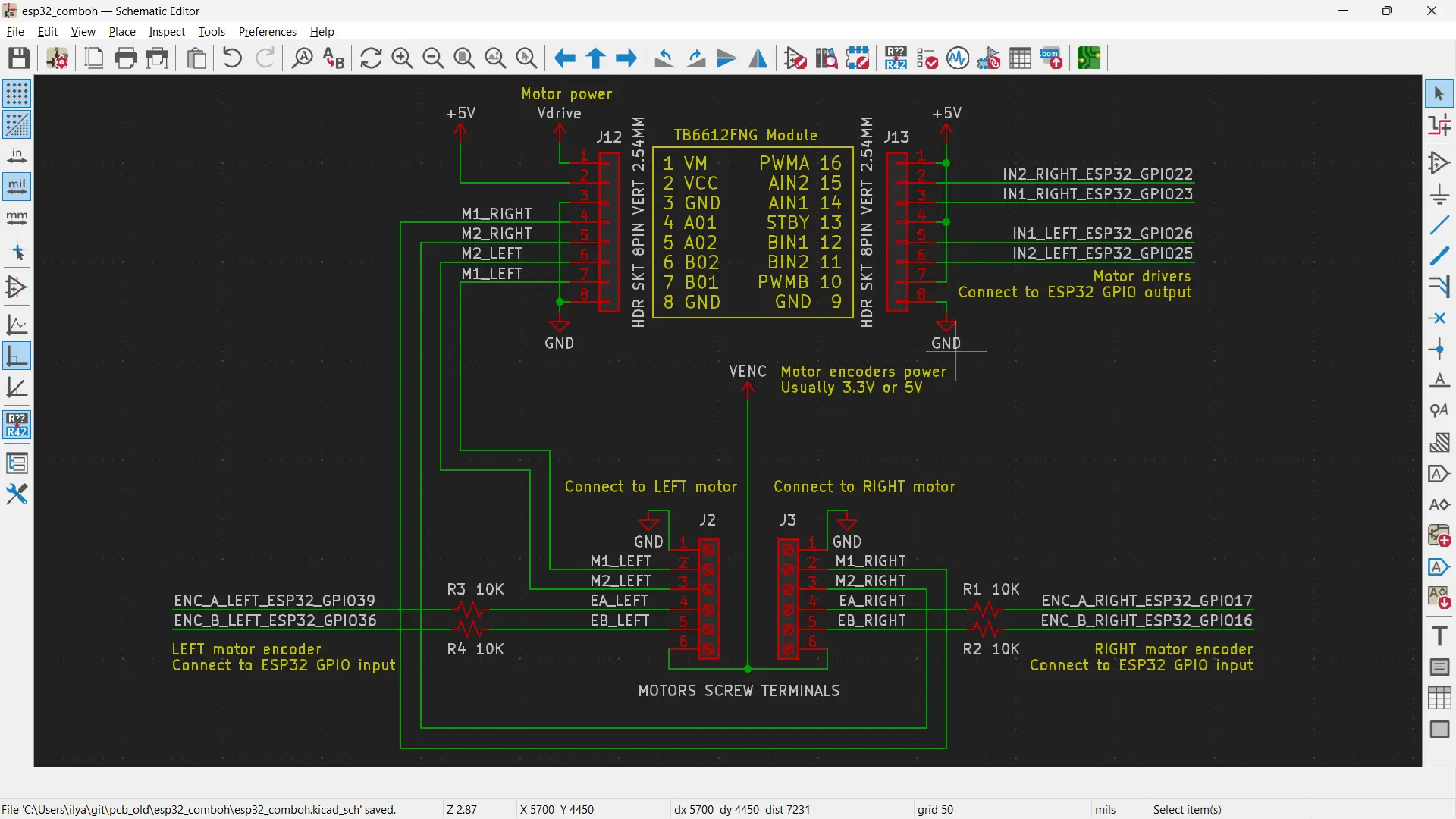 다음은 TB6612FNG를 ESP32 30핀 개발 보드에 연결하는 회로도입니다.