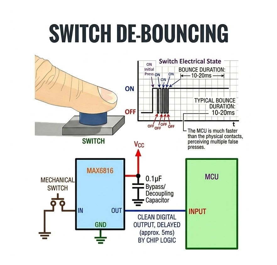 디바운싱은 노이즈를 걸러내어 이 문제를 해결합니다. 이 회로에서 MAX6816 비바운서 IC는 신호를 정제하고 약간의 지연 시간을 둔 안정적인 디지털 출력을 제공합니다. 바이패스 커패시터는 안정적인 작동을 보장합니다. 이를 통해 한 번의 누름이 하나의 동작으로 감지되도록 보장합니다.