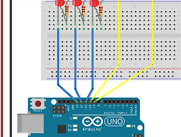 이전에 하던 작업을 깨끗하게 마무리 해보자. 일부 서보모터 제어코드에 동일한 원칙을 적용하고 몇 가지 추가적인 작업을 수행해 보자. 아래 그림과 같이 브레드 보드에 두 개의 서보모터를 연결하고, 가지고 있다면 세 번째 LED도 연결하자.