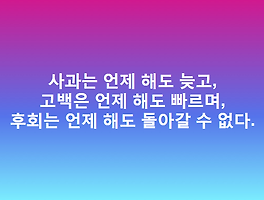 | 사과는 언제 해도 늦고, 고백은 언제 해도 빠르며, 후회는 언제 해도 돌아갈 수 없다. (1) | 2019.03.07 |