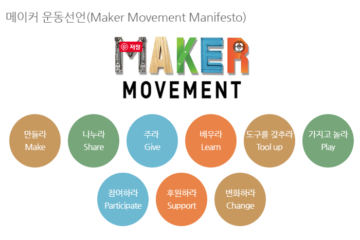메이커(Maker)란? 디지털 기기와 다양한 도구를 사용한 창의적인 만들기 활동을 통해 자신의 아이디어를 실현하는 사람으로서 함께 만드는 활동에 적극적으로 참여하고, 만든 결과물과 지식, 경험을 공유하는 사람들을 의미합니다.(* 메이커, 메이커 운동이라는 용어는 2005년 창간된 메이크 매거진을 통해 처음 언급되었으며, 이후 전 세계적으로 퍼지게 됨)