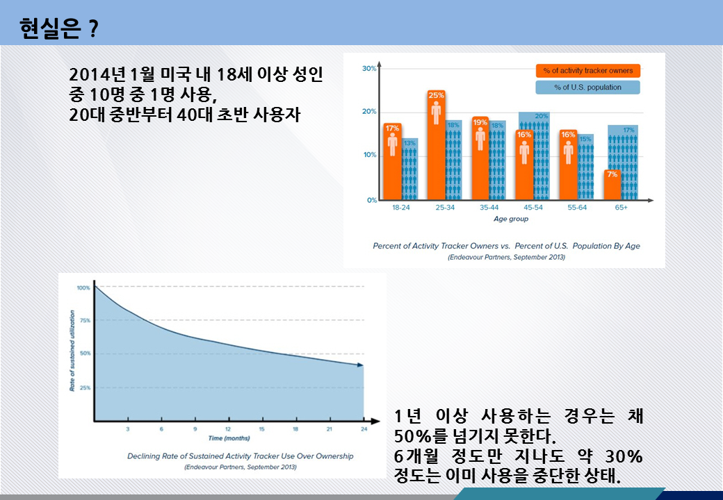 웨어러블 디바이스는다양한 영역에서 정보통신(ICT) 기술을 활용함에 따라 웨어러블 디바이스를 피트니스, 헬스케어·의료, 인포테인먼트 및 산업·군사 등의 목적으로 사용하고 있습니다. 건강 관리, 치료 목적의 웨어러블 기기의 관심이 증가하여 관련 시장이 급격히 성장하고 있으며, 소득수준이 증가함에 따라 여가생활을 즐기는 사용자들이 증가하고 이러한 사용자들의 니즈를 파악하여 운동효과를 높일 수 있는 웨어러블 제품이 많이 출시 되었지만 사용자층에 크게 받아들여지지 않고 있다고 보여집니다.