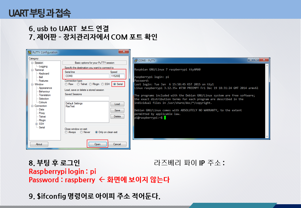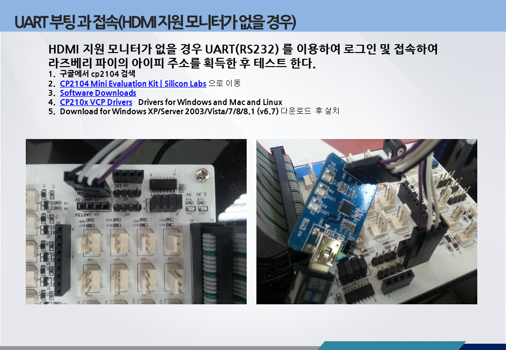 결국 라즈베리파이의 개발환경을 구축하는 일은 라즈베리파이의 IP 주소를 얻는 과정입니다. 물론 HDMI 모니터, USB 키보드 마우스, 그리고 공유기 까지 전부 연결하여 독립적으로 사용하는 환경이라면 최상이지만 사실 자원의 낭비라고도 볼 수 있습니다. 단지 랜 케이블 하나만 연결하면 자유자재, 적재적소, 능수능란, 능소능대하게 사용할 수 있다. 그리고 무엇보다 원격연결(네트웍 연결)은 무궁무진하고 놀라운 환경을 제공합니다. 오늘은 FTDI 케이블을 사용하여 UART Serial 포트로 PC 와 연결합니다. 아래 링크를 참고하여 자세한 연결법과 Window10 에서 연결 설정, 로그인 까지 하십시요. 모르는 부분은 질문하시고, 안되시는 분은 저를 불러 저와 함께 하시고, 정리가 필요한 분은 다시 설명이 필요하시면 말씀하십시요.