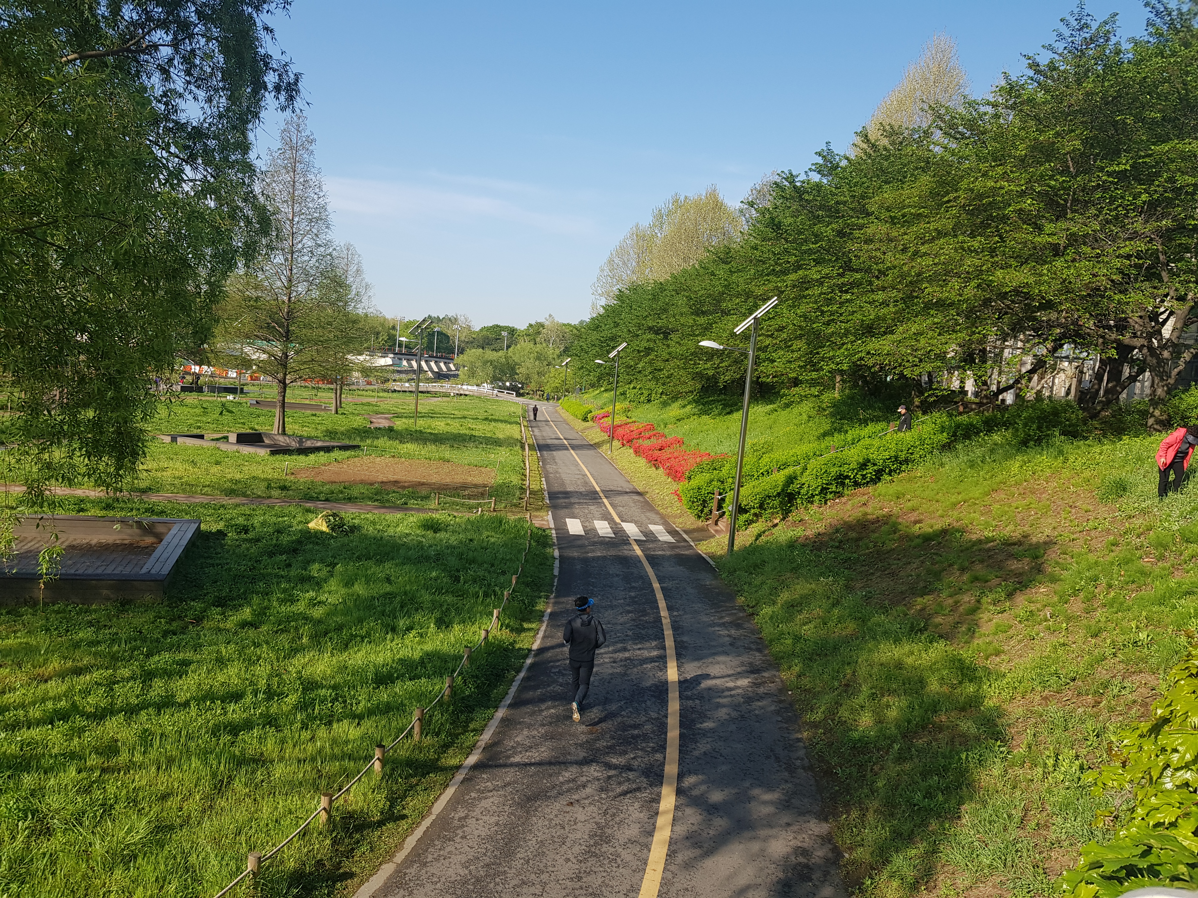 평일 저녁에는 아이들이 점령하는 인라인장을 회원들이 천천히 달립니다. 감독님의 구령으로 몸을 풀어주는 준비운동을 착실하게 합니다. 준비 체조가 끝나면 크게 구호를 외치고 모입니다. 공지사항이나 행사에 관한 내용을 전달합니다. 감독님이 오늘 훈련에 대해 설명합니다. 잘 달리는 A조는 영동대교 까지 약 16km를 달리고, 중간 정도 달리는 B조는 청담대교까지 왕복 14km를 달립니다. 부상자나 10km 러너는 등용문 반환까지 정해줍니다. 옷을 갈아입고 두 줄로 출발합니다. 양재천 주로를 달리는 모습은 꽃이 피었을 때나, 꽃이 지고 있는 때에도 멋진 모습입니다.