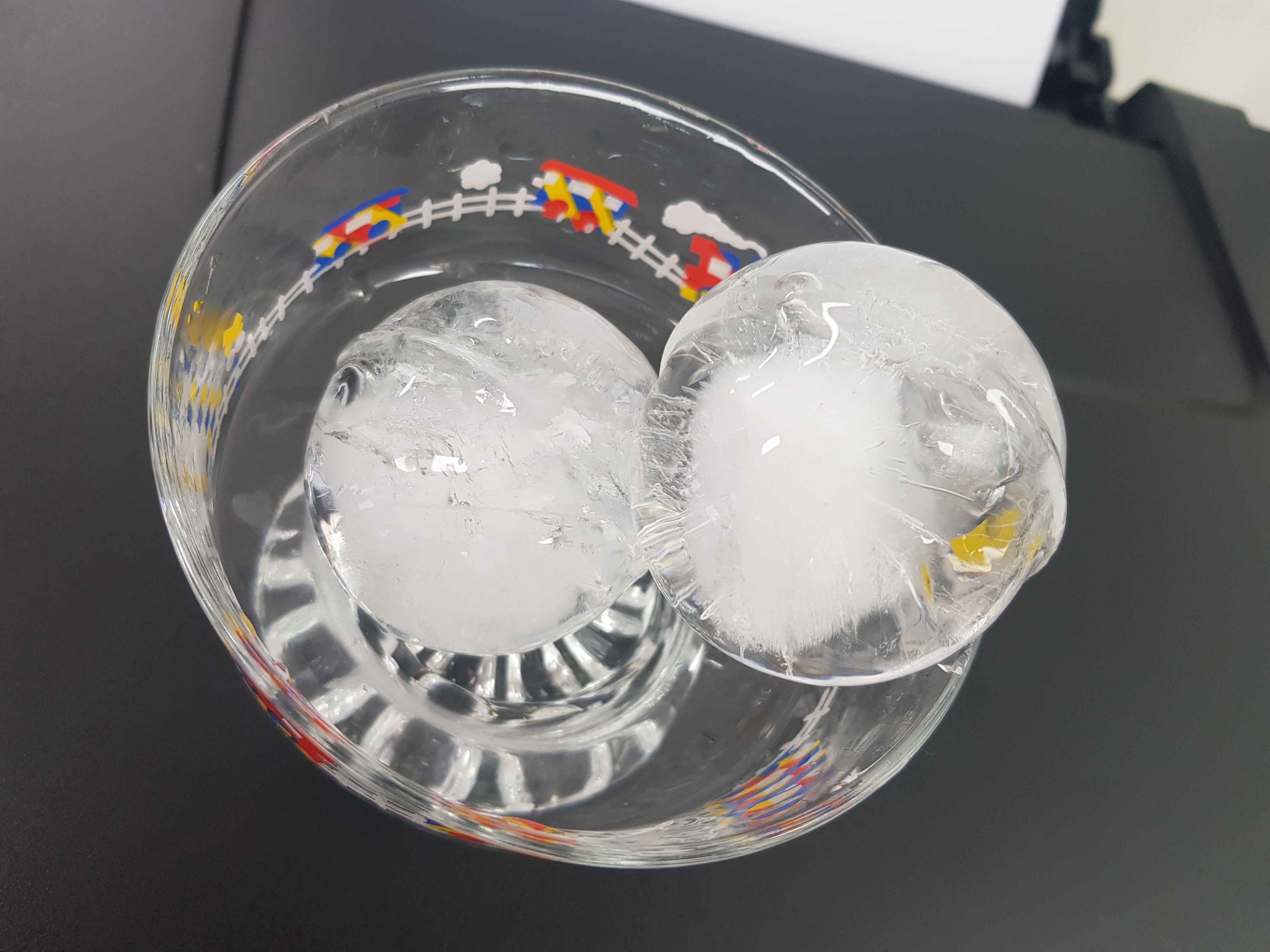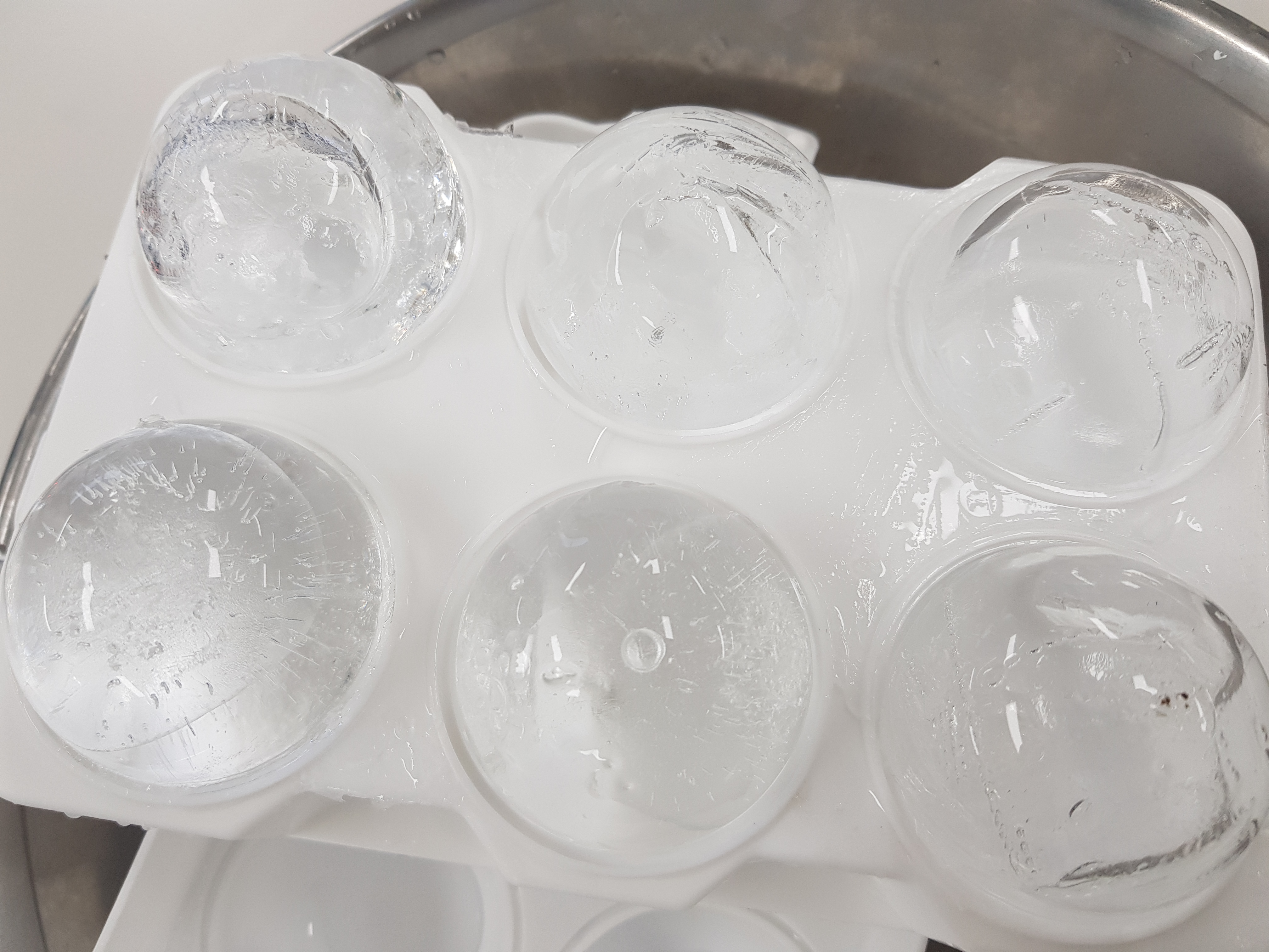 원형으로 만들어진 플라스틱 케이스가 있어서 물을 가득 채우고 얼려보았다. 완전 원형으로 나오려면 물을 채우거나 얼리는 과정을 신경 써야 한다. 기울이거나 물을 덜 채우면 완벽한 구 모양이 나오지 않는다. 잘 얼린 원형 얼음을 보니 예쁘긴 예쁘다. 그리고 물은 얼면서 부피가 30% 늘어나는 데 이러한 영향을 받지 않도록 새어 나오는 구멍이 또 있어야 한다. 완벽한 구 모양이 얼음을 자동으로 만들어주는 제조장치를 만들어야 한다.