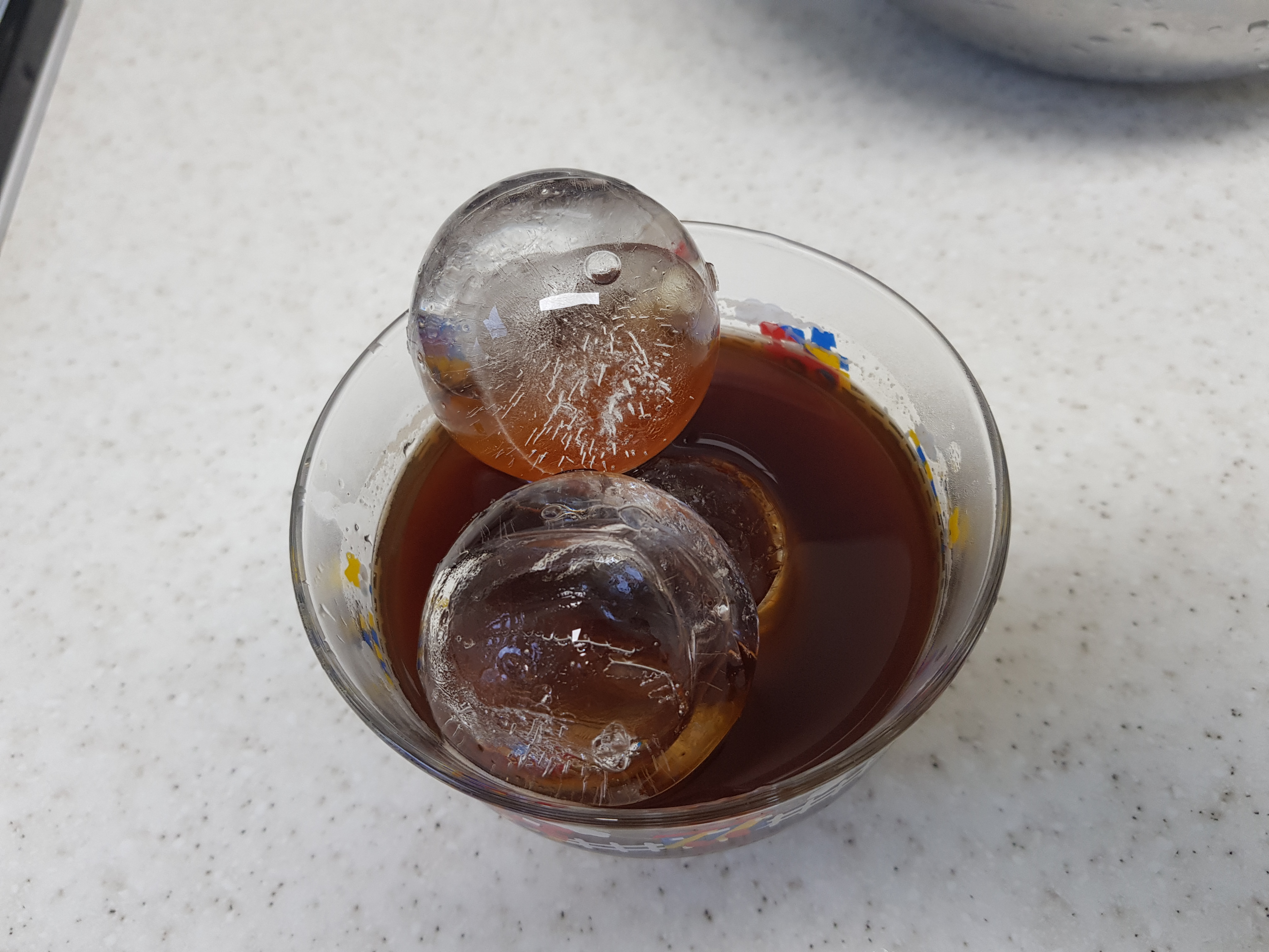 아래는 얼마나 아름다운지 보려고 플라스틱 케이스에 넣어 얼린 빙볼 = 아이스 볼 얼음이다. 물을 채우는 방법을 알고, 냉장고에 하루정도 지나서 보니 잘 얼었다. 커피에 넣어보니 정말 예쁘긴 예쁘다. 녹는 시간도 오래 걸리고, 단단하고 신기하다.