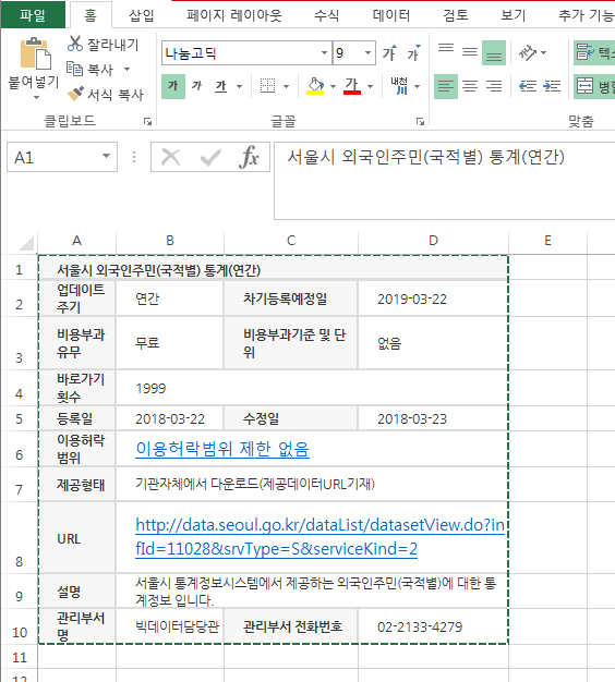 표를 가만히 보면 가로 칸수와 세로줄을 비슷하게 정해야 한다. 예로 든 위의 표를 보면 4칸이고 10줄이라고 보면 된다. 표 자체를 마우스로 긁어서 ctrl-C 하여 카피한다. 다음으로 엑셀을 사용한다. 엑셀을 열어서 맨 첫 칸에서 ctrl-V 로 붙여 넣는다. 붙여넣기 한 엑셀 화면이 아래에 있다.
