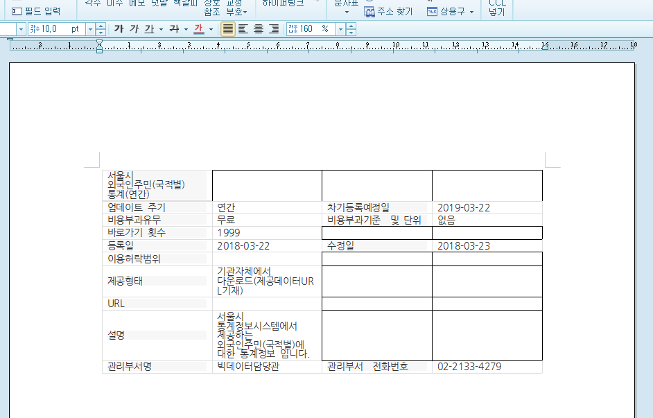이 상태에서 전체를 다시 ctrl-C 를 눌러 복사한다. 이제 마지막으로 한글 프로그램을 연다. 한글 프로그램을 열어서 4칸 10줄짜리 표를 만들고 ctrl-V를 눌러 붙여넣기 하는데 표 삽입 옵션에서 덮어쓰기를 한다. 그러면 아래 화면처럼 덮어써서 아름답게 표시된다. 물론 100% 완벽한 경우도 있고, 그렇지 않은 경우가 더 많지만 브라우저 표 모양을 한글로 불러들여 사용할 때 좋은 방법이다. 한글에서 약간만 보완하면 된다.