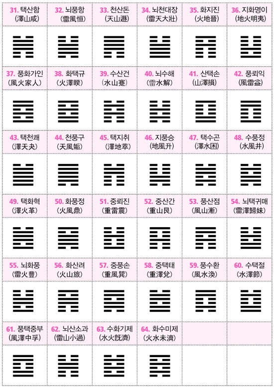 중산간이 단순히 옴짝달싹 못하는 것을 의미한다면 중수감은 피하지도 못하는 상황에서 견디기 힘든 고통을 겪는 것이다. 그래서 중수감은 4대 난괘 가운데 가장 큰 고통을 의미한다. 고통과 시련의 시기를 맞아 일관성을 유지하는 것은 쉽지 않은 일이다. 다만 그럼에도 자신이 가진 삶의 미학과 원칙을 간직하고자 노력한다면 당장 위기를 벗어나는 데에는 도움이 되지 않을지라도 긴 호흡으로 보면 훗날 더 큰 성취를 이룰 수 있는 바탕이 될 수 있을 것이다. 한 인간의 진로는 대개 어려움 앞에서 어떤 선택을 하는지에 따라 결정되기 마련이다. _〈제29괘 중수간, 늪에 빠졌을 때 발버둥을 치면 더욱 깊은 곳으로 빠진다〉 중에서.