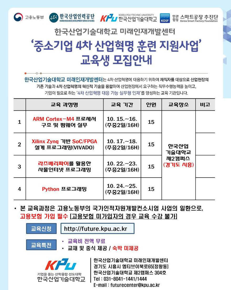 재직자 대상의 기술교육이 한국 산업기술대학교 제2캠퍼스에서 열린다. 총 4개의 과정은 아래 이미지를 참고한다. 여기서는 라즈베리파이를 활용한 IoT(사물인터넷) 교육을 소개한다.