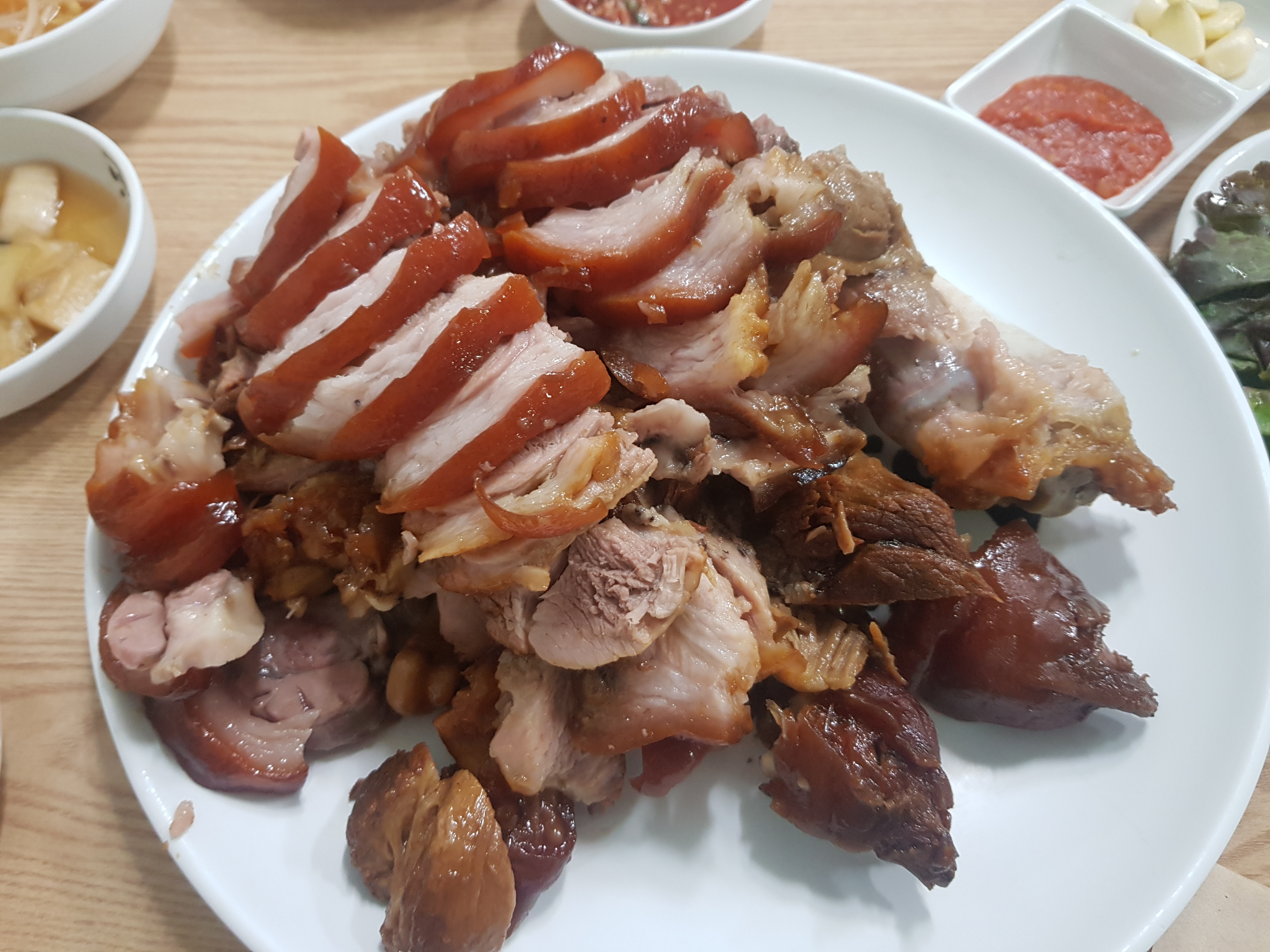 1. 냉동 수육을 해동하여 물에 설탕 1컵을 넣고 끓이다가 물 끓으면 물을 버린다.