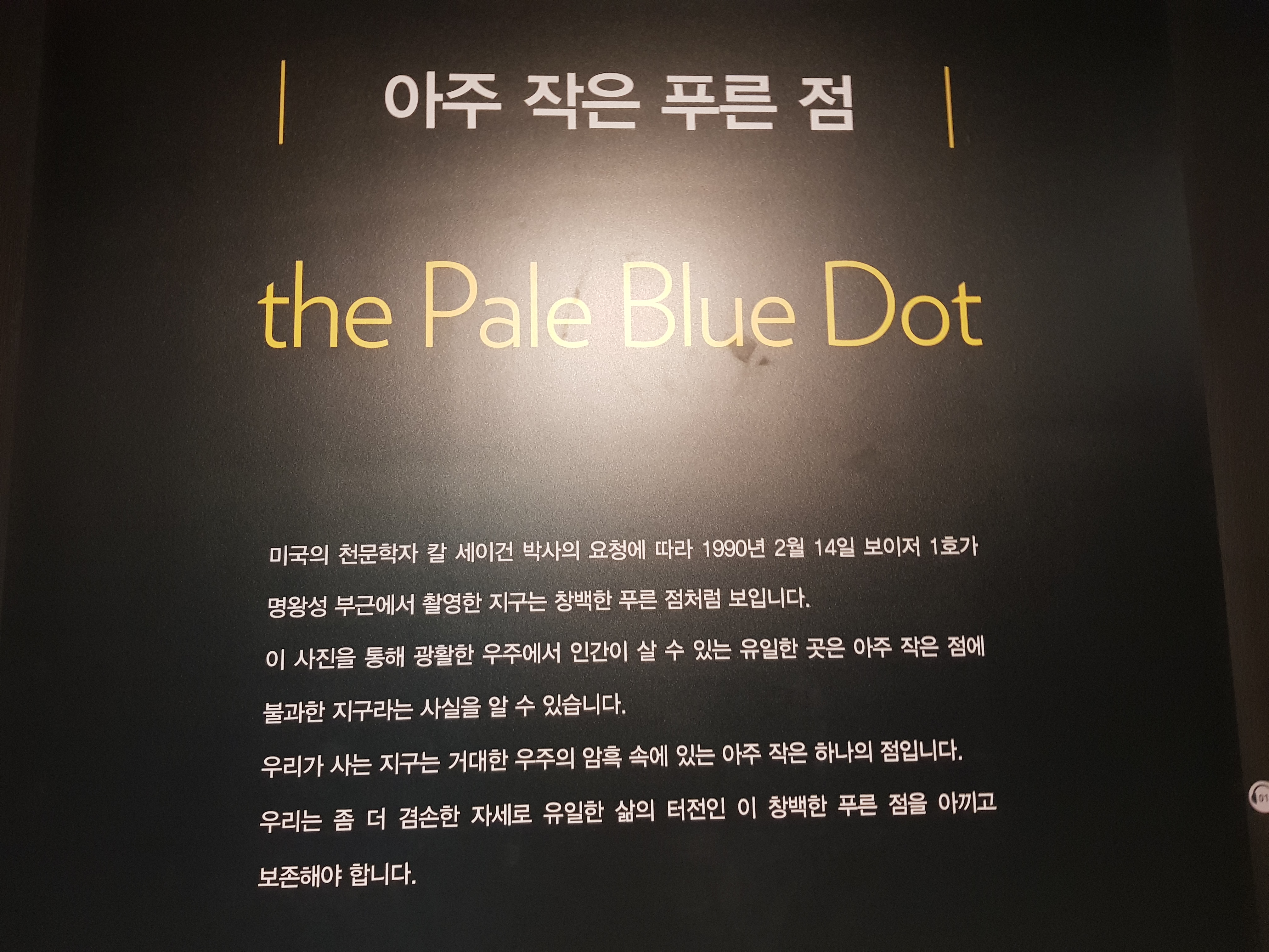 우리가 사는 이곳은 암흑 속 외로운 얼룩일 뿐이다. 이 광활한 어둠 속의 다른 어딘 가에 우리를 구해줄 무언가가 과연 있을까. 사진을 보고도 그런 생각이 들까? 우리의 작은 세계를 찍은 이 사진보다, 우리의 오만함을 쉽게 보여주는 것이 존재할까? 이 창백한 푸른 점보다, 우리가 아는 유일한 고향을 소중하게 다루고, 서로를 따뜻하게 대해야 한다는 책임을 적나라하게 보여주는 것이 있을까?