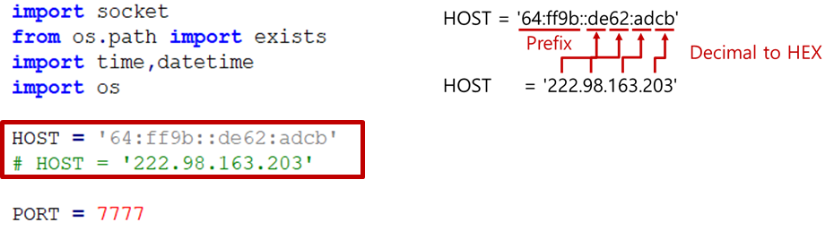 Raspberry Pi에서는 Python 2.72 버전을 사용하며, 우리넷의 외장형 모뎀의 경우 IPv6를 사용하므로 서버 IPv4 주소를 다음과 같이 변환하여 사용해야 한다. 변환 방식은 SK Telecom과 우리넷 모듈사가 협의한 규칙이므로 아래 그림에 표시한 형태로 변환하여 사용한다.