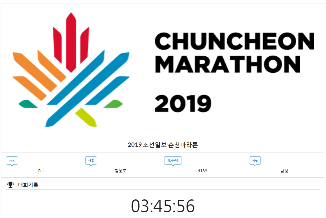 2019 춘천마라톤 공식 기록증 3시간 45분 56초