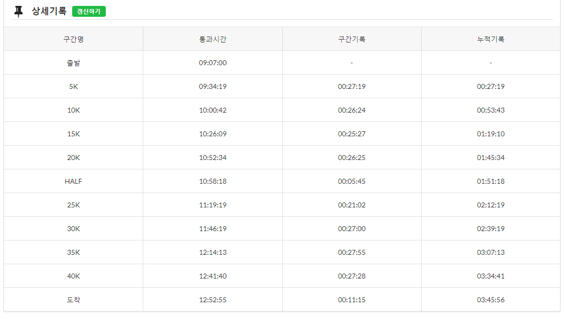 2019 춘천마라톤 상세 구간 기록. 매 5km 기록이 정확히 26분~27분.