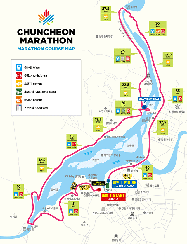춘천마라톤 코스도와 고저도. 가장 힘든 구간은 역시 27km~34km 구간이다.