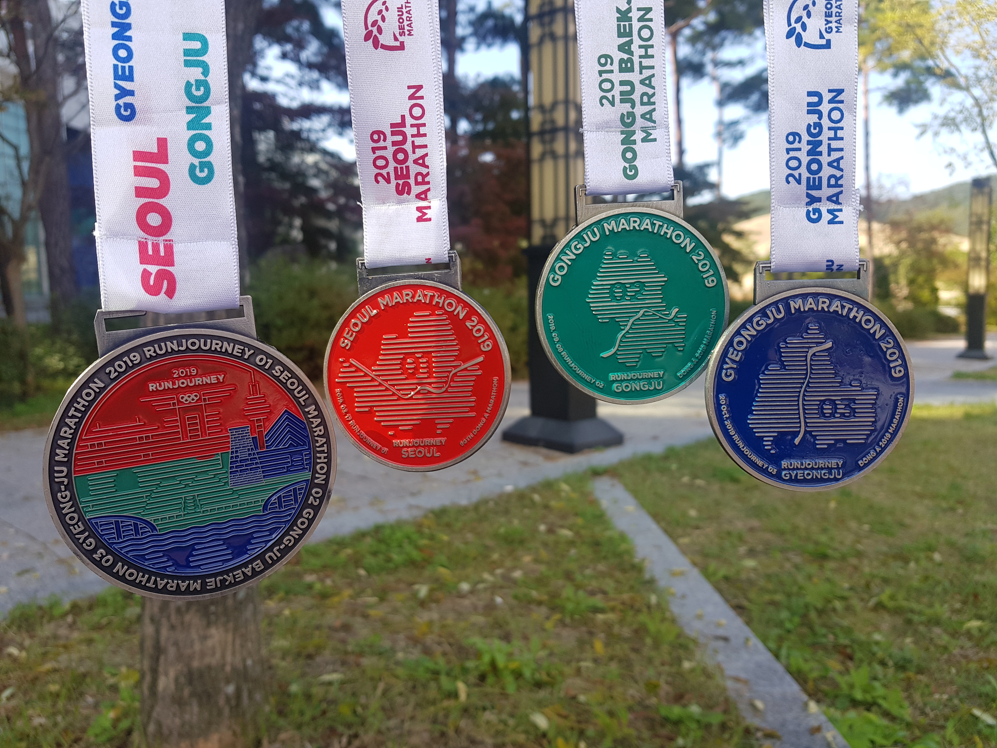 사진 왼쪽부터 런저니메달, 서울마라톤, 공주백제마라톤, 경주마라톤 메달